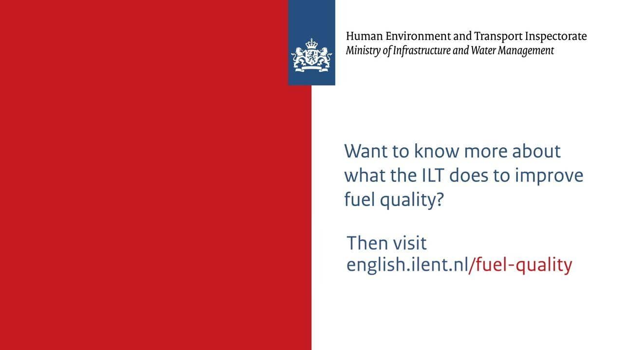 On-screen: Logo Dutch government, Human Environment and Transport Inspectorate, Ministry of Infrastructure and Water Management. Want to know more about what the ILT does to improve fuel quality? Then visit english.ilent.nl/fuel-quality.